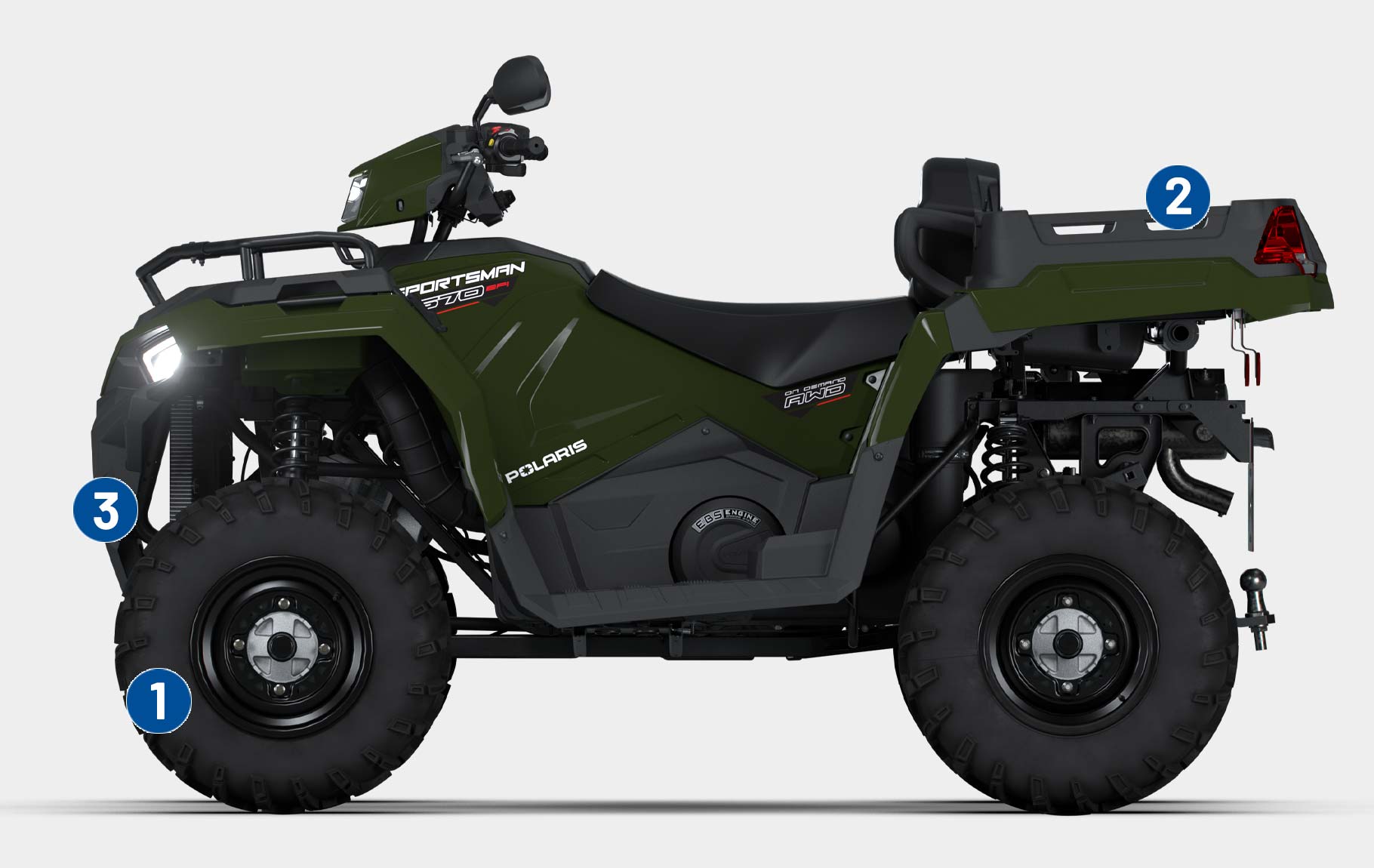 3 modes de conduite : Standard / Travail / Performance, Prise électrique 12 volts, port de charge lente intégré, pré-câblé pour chauffe-mains et chauffe-pouces, système de sécurité activé par code PIN, Treuil de 1 587kg (3 500 lb) avec corde synthétique et NOUVEAU système d'arrêt automatique, Rallonge de porte-bagages avant, benne basculante, protections de bras triangulaires avant et arrière, plastiques peints
